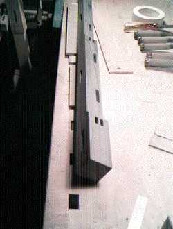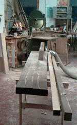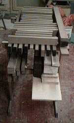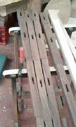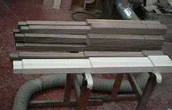 1: Sawing phase: the birch test legs have been through all the stages of sawing; the walnut legs await the final pass through the saw. However, all the bevels have been cut.