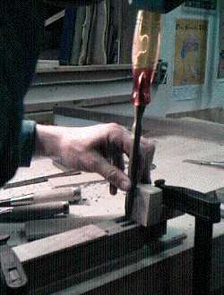 2: A close up of the trimming operation. Note the angled block to maintain a consistent angle on every mortice. Here I am working on the double mortice.