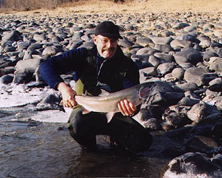 Double Whammy What looked like an ideal cure for the absurdly high and dirty river condtions, that is clear skies and cold air, within a week presented yet another set of obstacles for one's angling aspirations: ice. Ice everywhere, in the water, in the guides, all over the rod, and coating the line. We went from warm wet weather producing the flood conditions, to very cold freezing weather nearly shutting down the rivers; in the space of a little over a week. To add to the mix of angling conditions we were thrown a new ugly twist: dirty (essentially "out") water with slush ice coming down. I have never seen that combination in all my time on these rivers. It seemed that there was so much raw earth gouged out of the banks of the river, that it was like a big "gravel washing machine" and it took much longer to clear than any other high water event I have seen. So we went down to the big water, which while still icing, at least it was clear. And there were fish to catch, so long as you worked through all of the other icy problems that were standing between you and those fish. |