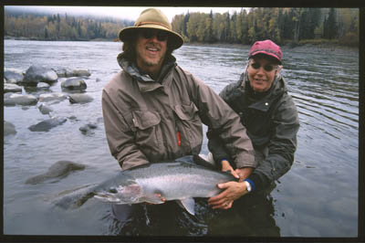 Ralph and Lauraleen By the time Ralph and Lauraleen Gaudio arrived, I was thinking that we might really be able to get into some fish. The river conditions were perfect; but by then it was obvious that we just were not looking at large numbers of fish this year. It would take a lot more than low fish numbers to dampen the spirits of these two, however, and we managed to always find something to laugh at, talk about, and of course even catch a few fish . . . There was this one fish. . . We're fishing the home waters, having put in right in front of the B&B where they stay, and Ralph is well into the rhythm of the run, working it carefully, as always. Lauraleen and I are doing the sensible thing on that chilly October morning, and having tea and cookies at the raft; when Ralph says, "There's one!" (what else would Ralph say when he hooks a fish?). Then he immediately says, "It's just a dolly! Yep. Dolly!" The rod was bending in a suspi-ciously un-dolly way. He says, "oh, wait . . . I don't know what it is, dolly I think . . ." 15 minutes later we landed and photo-graphed the lovely 39 1/2 x 20 buck in the picture to the right. |