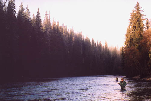 | Ted and Dick Jacobsen, welcoming the warm, morning sun, as they work through a rarely fished glide on an upper beat. | ||||||||||||||||||||||||||||||||||||||||||||||||||||||||||||||||