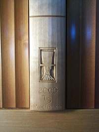 A detail of the Mykiss logo carved into the bottom of the post. This picture also shows the fluting in the headboard panel very well.
