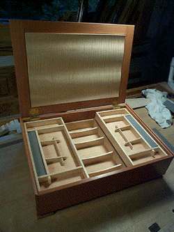 Here the box is almost finished, the ring holders have yet to be finished, and in this picture the handle is not in place. It is however the best image of the whole box and the interior.
