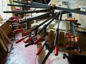 2) The form is bolted onto the work table so there are no little problems during the glue-up. Also, there is serious clamping pressure brought to bear on this, so all must be in it's place from the bottom up.