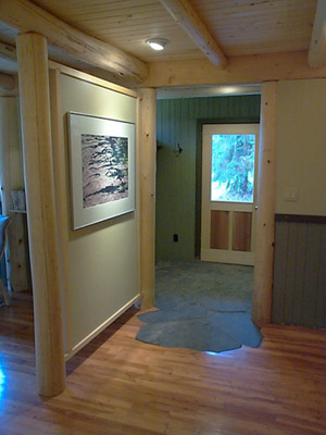 Here is a better view of the stone chimney. Note the small but nonetheless perfect, Jøtul woodstove. The slate hearth is in and worked out really well. You can see the slate in the mudroom and let into the floor of the gallery area as well on the first picture at the top of the page. It is fine example of the perfect blending of form and function.