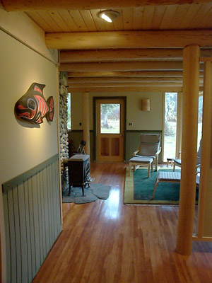 I am particularily fond of the ceiling, it is a fine combination of natural edges (the logs that hold it all up) and tight millwork (in the tongue & groove paneling).